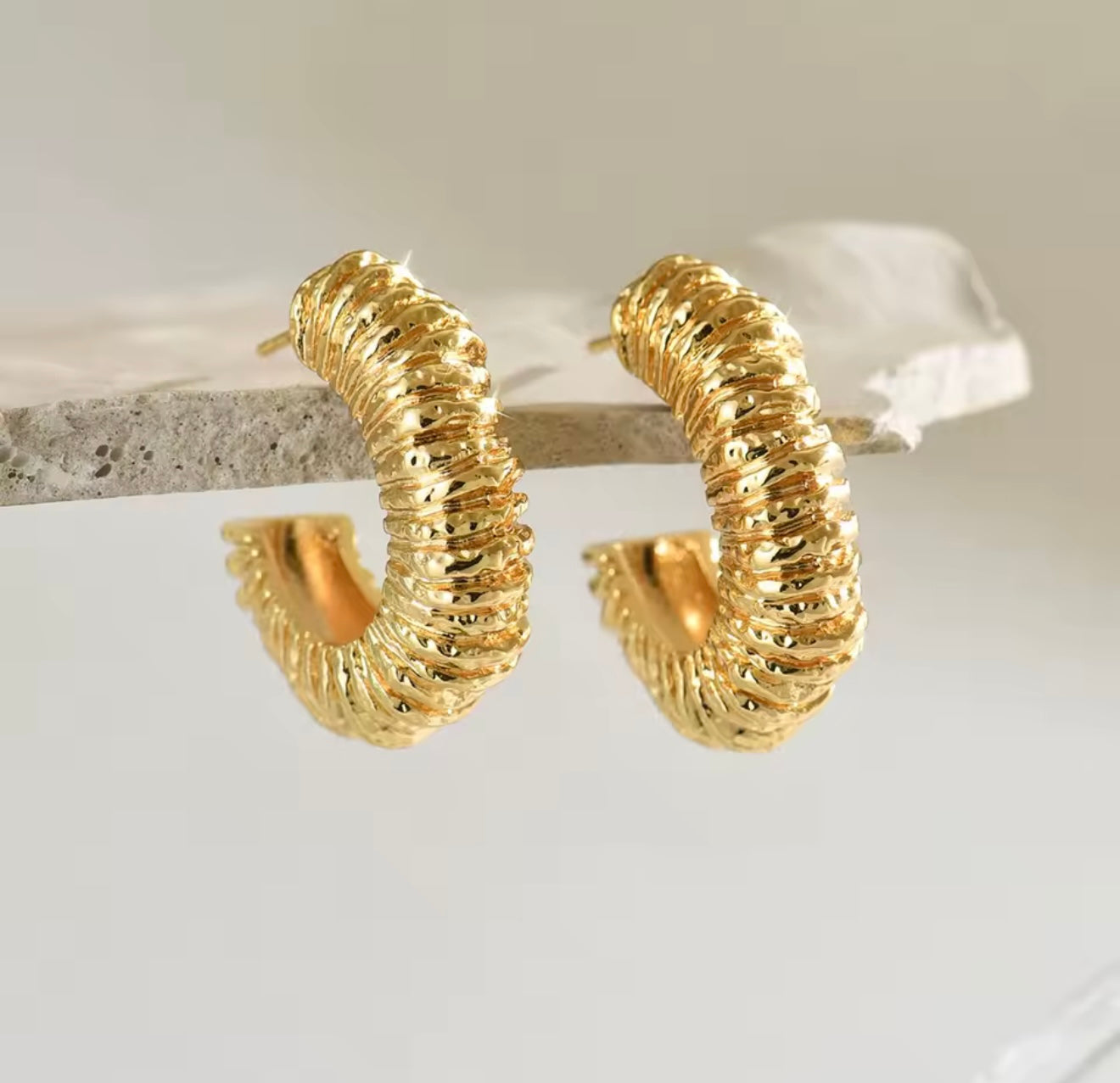 Gli orecchini Sandra sono eleganti cerchi dorati dal design bombato e lavorato a rilievo. La superficie presenta una texture ondulata che riflette la luce con intensità, donando un effetto luminoso e sofisticato. Perfetti per aggiungere un tocco chic e deciso sia agli outfit quotidiani che a quelli più eleganti.